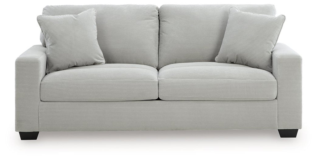 The crisp neutral hue and striking design details of this sofa create a living room that expertly reflects your contemporary taste. For irresistibly cool textural appeal, the ultra-soft fabric is enhanced by a small-scale corded look. With a clean-lined silhouette complete with track arms, this sofa allows you to take a trend-right approach to everyday living.