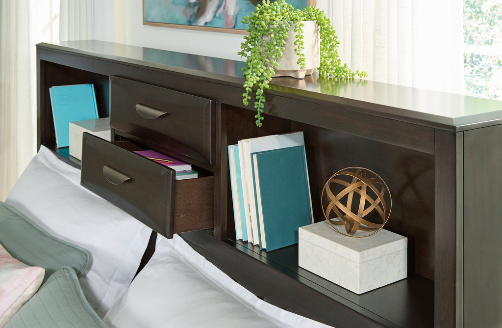 A rich, metropolitan finish. Unbeatable function. With this queen storage bed, it’s a breeze to create a casual contemporary hideaway full of style and convenience. It combines thoughtful craftsmanship and handy storage, with assorted drawers to help you maintain an organized and clutter-free space. Cubbies in the headboard keep bedtime reads close while also acting as the perfect perch for bedroom decor.